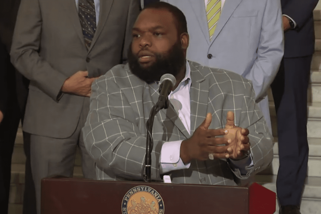 Pennsylvania state Rep Jordan Harris majority chair of the House Appropriations Committee speaks at a press conference at the state Capitol in Harrisburg July 8 2025 Pa House VideoYouTube